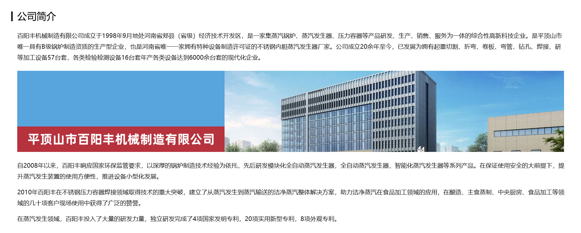 百陽豐機(jī)械制造有限公司成立于1998年9月地處河南省郟縣(省級(jí))經(jīng)濟(jì)技術(shù)開發(fā)區(qū),是一家集蒸汽鍋爐、蒸汽發(fā)生器、壓力容器等產(chǎn)品研發(fā)、生產(chǎn)、銷售、服務(wù)為一體的綜合性高新科技企業(yè)。是平頂山市一家具有B級(jí)鍋爐制造資質(zhì)的生產(chǎn)型企業(yè),也是一家擁有特種設(shè)備制造許可證的不銹鋼內(nèi)膽蒸汽發(fā)生器廠家。公司成立20余年至今,已發(fā)展為擁有起重切割、折彎、卷板、彎管、鉆孔、焊接、研等加工設(shè)備57臺(tái)套,各類檢驗(yàn)檢測設(shè)備16臺(tái)套年產(chǎn)各類設(shè)備達(dá)到6000余臺(tái)套的現(xiàn)代化企業(yè)。